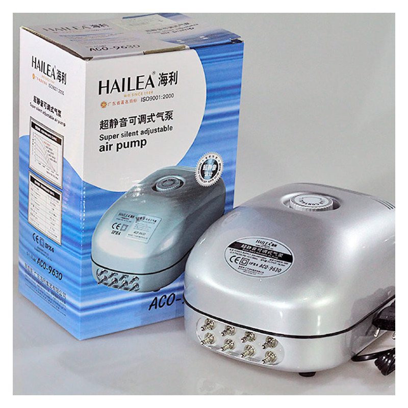 Tichý akvarijní kompresor Hailea ACO 5505 s regulovatelným průtokem 330 l/h a dvěma nerez vývody...