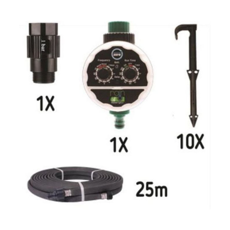 • Kompletní sada pro okamžité použití: Nemusíte nic dokupovat. Balení obsahuje vše, co potřebujete k okamžitému spuštění: jednoduchou řídící jednotku, 3/4" regulátor tlaku, připojovací adaptéry, 16mm fitinky, 25 metrů odkapávací hadice a kotvící body.
